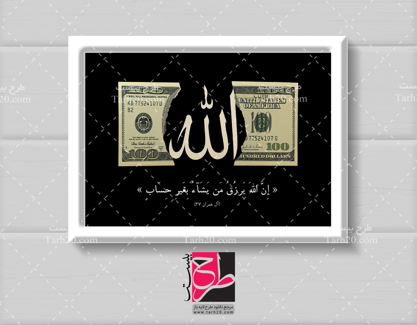 قابل چاپ به روش افست برای موضوعات : عکس دلار، تابلو رزق و روزی، تابلو دلار، تابلو عکس آیه روزی، تابلو ان الله یرزق، فون عکس صوتی می باشد که توسط طراحان سایت طرح ۲۰ ( طرح بیست ) در اندازه 20 در 30 سانتیمتر بشکل تکرو بر اساس روانشناسی رنگ ها طراحی شده است.