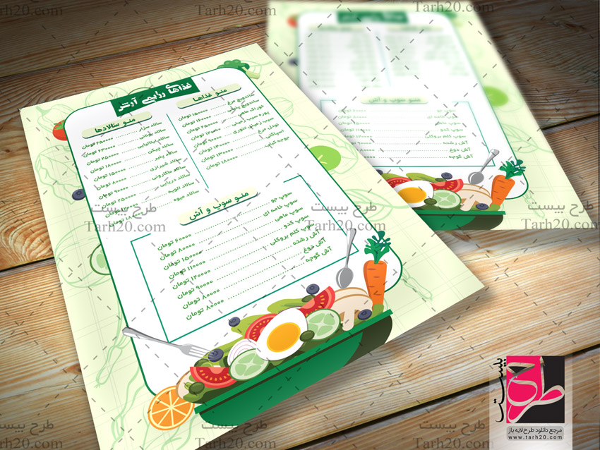 قابل چاپ به روش افست برای موضوعات : رستوران سبزیجات، رستوران رژیمی، غذاهای رژیمی، سالاد ، غذاهای سبزیجات، غذاخوری، کترینگ، غذای تلفنی، آشپزخانه سنتی، تله رستوران می باشد که توسط طراحان سایت طرح ۲۰ ( طرح بیست ) در اندازه 21 در 29.7 سانتیمتر بشکل تکرو بر اساس روانشناسی رنگ ها طراحی شده است.